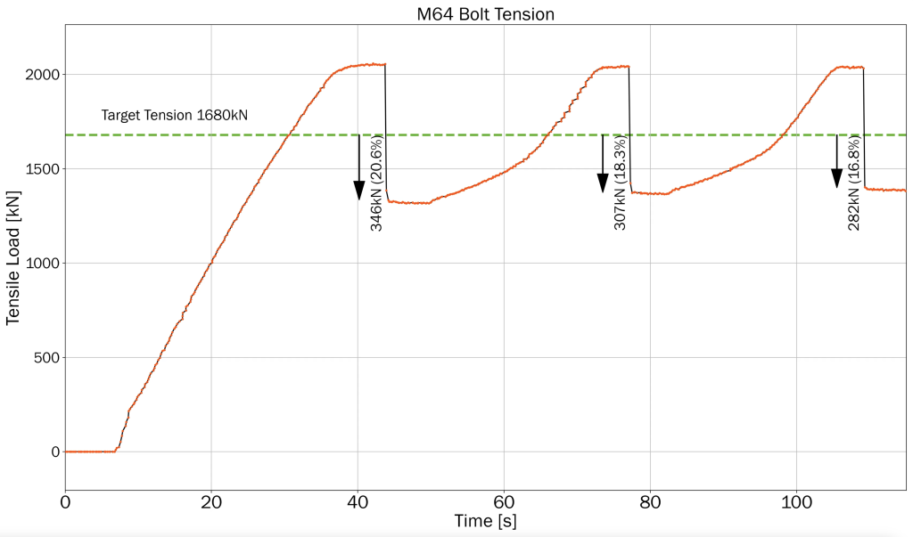Transmission Dynamics’ engineers conducted a study at the Levenmouth demonstration turbine, where they installed six M64 bolts. A hydraulic tensioner was used in standard operation, alongside instrumented bolts equipped with BoltSense® LMF+ technology. Both sets of data were recorded simultaneously. Despite attempts to overcompensate for the target load of 1,680 kN, the instrumented bolts revealed under-tension as soon as the hydraulic pressure was released. This highlights the shortcomings of hydraulic tensioner methods. The results of this project will be disseminated globally to ensure critical aspects of bolted join integrity are properly handled and addressed.